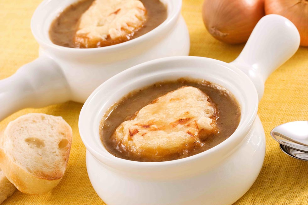 Classic simple French onion soup recipe, with beef stock base, slow-cooked caramelized onions, French bread, gruyere and Parmesan.