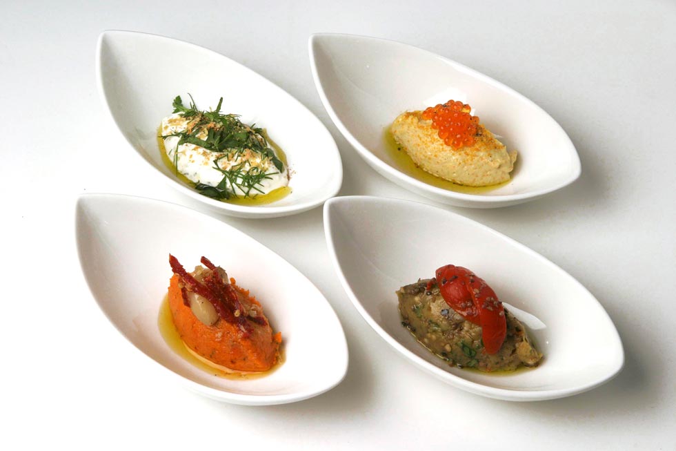 Start with a cracker or thin slice of bread. Make a creamy sauce with sour cream and dill and top it with a piece of smoked salmon.
